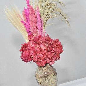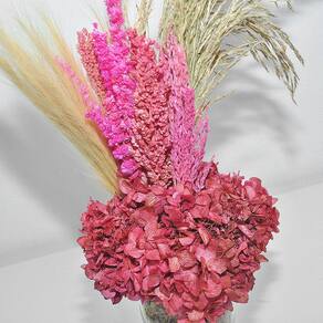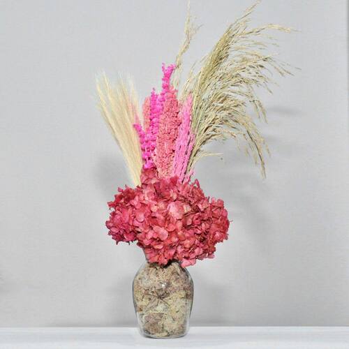 Arranjo de flores desidratadas com hortênsia vermelha + vaso de vidro