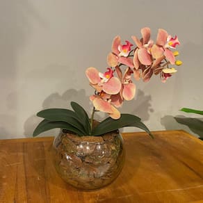 Arranjo permanente de Orquídea em efeito hiper-realista com vaso transparente.