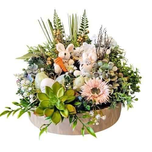 - Elementos Encantadores: Apresentando coelhos em pelúcia de cor neutra entre as flores permanentes, este arranjo traz um toque lúdico e festivo à sua decoração de Páscoa.