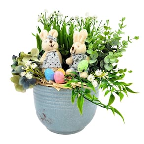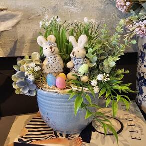 Arranjo De Páscoa Com Vaso Casal De Coelho Azul Decoração