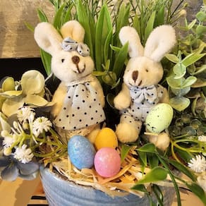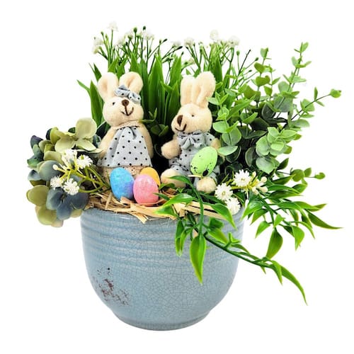 - Elementos Encantadores: Apresentando coelhos em pelúcia de cor neutra entre as flores permanentes, este arranjo traz um toque lúdico e festivo à sua decoração de Páscoa.