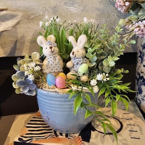 - Qualidade Premium: Utilizamos apenas as flores permanentes de mais alta qualidade, garantindo a beleza deste arranjo ao longo da temporada de Páscoa.