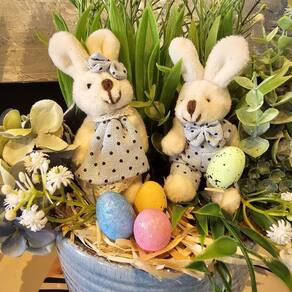 - Elementos Encantadores: Apresentando coelhos em pelúcia de cor neutra entre as flores permanentes, este arranjo traz um toque lúdico e festivo à sua decoração de Páscoa.