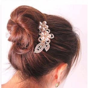 Enfeite de cabelo tipo garfo para noivas, debutantes, formaturas e festas em geral. Dourado levemente rosê com pérolas sintéticas e strass. Aproximadamente 8 cm de comprimento. Incluso: 01 arranjo Marca: De Castro Joias Ean: 7890999653966