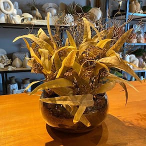Arranjo permanente de Flores Secas em efeito hiper-realista com vaso incolor de vidro.