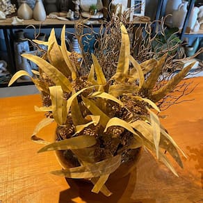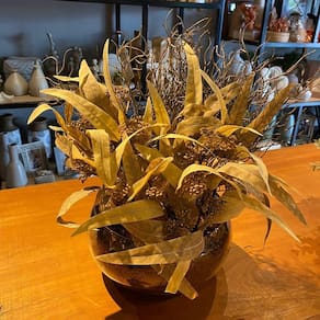Com flores secas, folhas secas, galhos secos, cascas e vaso em vidro, esse arranjo é ideal para aparador, mesa de jantar ou aparador.