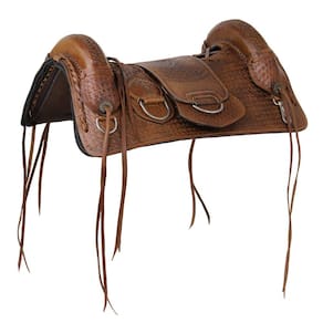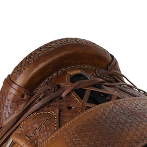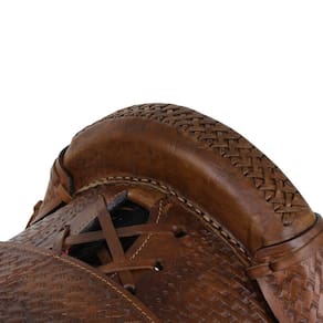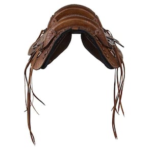 Um Arreio modelo Charuto da marca A Pantaneira, utilizado em Muares e Equinos, fabricado em couro nobre na cor Marrom com costuras reforçadas, detalhes em margaridas de metal com envelhecido, assento em couro com tamanho livre de 16", argolas em aço inox, travessão móvel, acabamento do suador revestido em couro com enchimento de feno.