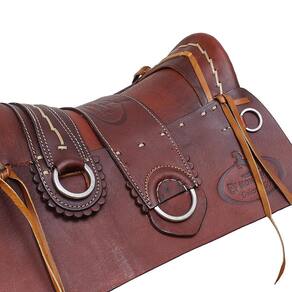 Arreio Ev Montaria modelo Pantaneiro, utilizado em Muares e Equinos, fabricado em couro nobre cor Havana com costuras reforçadas, tamanho livre do assento de 17", armação de chapa de ferro inervada e acabamento do suador com enchimento em feno, revestimento em couro e bordas em nylon costurado. Acompanha travessão fixo e argolas em aço inox.
