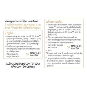 MICRO-ONDAS: Em um tigela refratária com bordas altas colocar: 1 xícara (200g) de arroz Tio João Parboilizado Integral, 1 colher (chá) de sal e 1 colher (sopa) de óleo. Acrescentar 2 xícaras (525ml) de água quente. Colocar a tigela refratária semitampada no micro-ondas na potência máxima e cozinhar por 20 minutos*. Desligar o micro-ondas e esperar 2 minutos. Servir. RENDE 3 A 4 PORÇÕES.