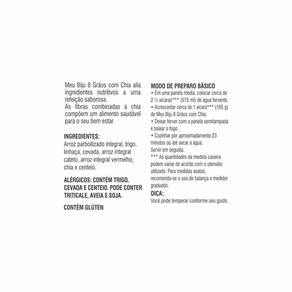 Mistura de 8 grãos com chia: arroz parboilizado integral com trigo, cevada, arroz integral cateto, arroz integral vermelho, centeio (93,3%), linhaça e chia.