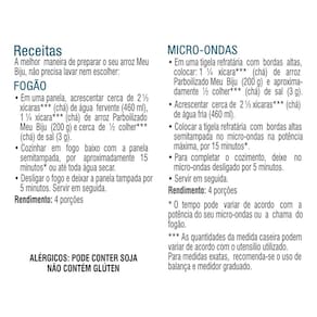 "Fogão: Em uma panela, acrescentar 2 xícaras (460ml) de água fervente, 1 xícara (200g) de Arroz Parboilizado Meu Biju e temperar a gosto. Cozinhar em fogo baixo com a panela semitampada, por aproximadamente 20 minutos ou até toda a água secar. Manter a panela tampada até servir. Micro-ondas: Em um tigela refratária com bordas altas colocar: 1 xícara (200g) de Arroz Meu Biju Parboilizado e 1 colher (chá) de sal. Acrescentar 2 xícaras (525ml) de água fria. Colocar a tigela refratária com bordas altas semitampada no micro-ondas, na potência máxima, por 18 minutos*. Desligar o micro-ondas e esperar 2 minutos. Servir. "