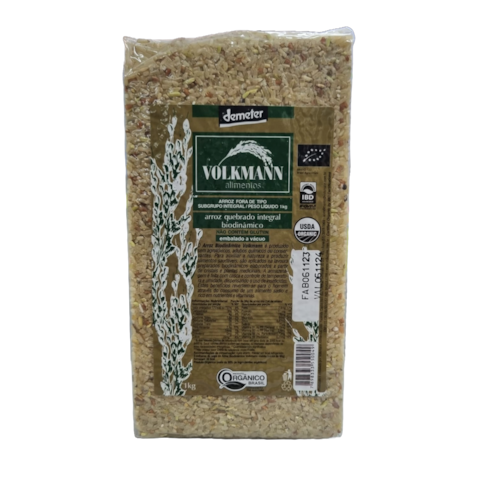 O Arroz Quebrado Integral Orgânico Biodinâmico Demeter Volkmann passa somente pelo processo de descasque em que a casca é retirada ficando as fibras e o germe. É produzido sem agrotóxicos, adubos químicos ou conservantes.