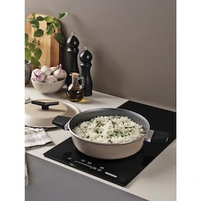 Se a ideia é preparar arroz com agilidade e sem complicações, a arrozeira Tramontina Spezia Induction é a aliada ideal. Com 24 cm de diâmetro e capacidade para 2,5 litros, ela é feita em alumínio de 3 mm de espessura e conta com revestimento interno e externo antiaderente Starflon Excellent, que evita que os grãos grudem e facilita a limpeza. O aquecimento uniforme garante resultados consistentes, enquanto a cor areia leva um toque de modernidade à sua cozinha.