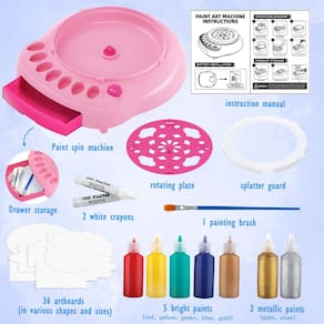 Artes e artesanato para crianças de 4 a 8 anos, kit de máquina de arte giratória, conjunto de artesanato para crianças de 6 a 9 anos, conjunto de kits de brinquedos giratórios de pintura legal, materiais de arte, presentes de aniversário para meninos e meninas de 6 a 7 8 9 10 11 e 12 anos - Máquina de arte giratória de pintura criativa: mergulhe no mundo da arte de respingo, onde você pode criar obras-primas exclusivas e se divertir com a pintura giratória. Liberte sua criatividade com nosso mecanismo giratório durável que garante infinitas sessões artísticas e criações hipnotizantes de arte giratória - Kit de pintura tudo-em-um: este kit de pintura multifuncional tem tudo o que você precisa para começar: uma máquina de girar tinta, uma placa rotativa, um protetor contra respingos, 5 tintas brilhantes, 2 tintas metálicas brilhantes, 36 pranchetas em vários formatos, 1 pincel e 2 giz de cera brancos para efeitos especiais. A máquina de centrifugação de tinta ainda vem com um compartimento de armazenamento conveniente para manter todas as suas tintas bem organizadas - Seguro e fácil de montar: a segurança é nossa principal prioridade, e é por isso que nosso kit de pintura não é tóxico e adequado para crianças, perfeito para jovens artistas. Com um protetor contra respingos e um processo de configuração fácil, este kit garante uma experiência de arte sem bagunça para artistas de todas as idades. Se a velocidade do chassi for lenta ou não conseguir girar, pode ser devido ao acúmulo excessivo de tinta no interior. Basta limpar a tinta interna com um pano úmido; não enxágue com água - Atividade criativa de artes e artesanatos: deixe sua imaginação voar com 7 tintas vibrantes e metálicas, juntamente com 36 pranchetas em diferentes formas e tamanhos para fazer cada criação se destacar de forma única. O kit de máquina de arte giratória de pintura é uma atividade fantástica de artes e artesanato que estimula a criatividade, melhora a exploração de cores, melhora a coordenação motora manual e estimula a expressão artística e o pensamento imaginativo através da arte prática - Presentes de pintura incríveis para crianças: este incrível kit de pintura é um ótimo presente para crianças e adultos! Perfeito para festas de artesanato, atividades artísticas, projetos de sala de aula e muito mais. Seja para feriados, aniversários, dia das crianças, Páscoa, Natal, Dia das Bruxas, Ação de Graças ou Ano Novo, este kit de pintura é um presente maravilhoso para crianças de 6, 7, 8, 9 e 10 anos de idade. Deixe a criatividade fluir com nosso kit de máquina de arte de spin de pintura