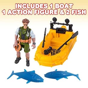 com uma figura de ação de 4" de altura, barco de 5" de comprimento e (2) peixes de 2,25" de comprimento. Mas a diversão não termina no jogo de faz de conta; O barco funciona como um brinquedo de banho flutuante também! Coloque-o