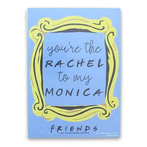 - Arte de parede com placa de caixa: apimente a decoração do seu quarto com esta linda arte de parede de placa de caixa Friends de 12,7 cm x 17,7 cm x 17,8 cm x 3,8 cm. Apresenta as palavras "You're the Rachel to my Monica" dentro da clássica moldura amarela Friends contra um fundo azul