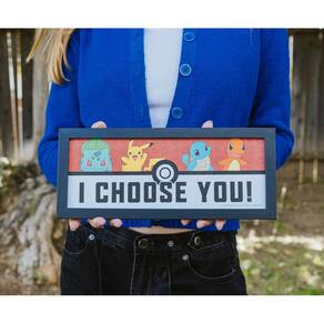 - DESIGN DIVERTIDO: A arte de parede em madeira apresenta vários personagens Pokémon e diz “Eu escolho você!”.