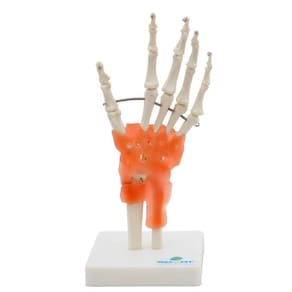 Modelo anatômico de articulação de mão é confeccionado em PVC e polímero flexível o que lhe confere um alto detalhe anatômico;  O modelo SD-5018 é Composto por: * Ossos do carpo (Fileira Proximal: Escáfoide, Semilunar, Piramidal, Pisiforme / Fileira Distal: Trapézio, Trapezóide, Capitato, Hamato,* Ossos do Metacarpo: 5 Ossos metacarpianos longos demonstram uma epífise proximal que é a base, uma diáfise (corpo) e uma epífise distal (cabeça)* Ossos dos Dedos da Mão: 4 falanges: Polegar com 2 falanges (proximal e distal), os demais dedos com 3 falanges (proximal média e distal),* Parte da ulna,* Parte do rádio,* Processo estilóide da ulna, * Processo Estilóide do rádio, * Ligamentos articulares ;
