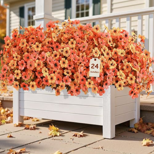 Alupssuc 24 pacotes de flores artificiais para mães de outono para decoração ao ar livre, violeta de seda resistente a UV e eucalipto falso, plantas falsas para o outono, para decoração externa, quintal, casa, pátio, varanda, laranja e vermelho