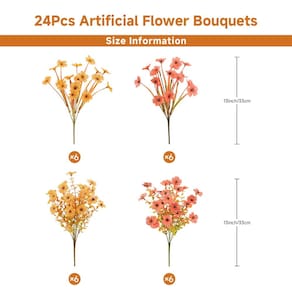- Quantidade e tamanho perfeitos: inclui 24 peças de flores artificiais para mães, 12 peças combinadas com eucalipto e a outra com grama de folha. Cada um deles é dividido em duas cores (laranja e vermelho). Existem 4 estilos de flores ao todo, e cada estilo tem 6 buquês. (sem vaso)