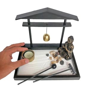 Com medidas de 22 x 15,5 x 18 cm e peso de 687g, ele se encaixa facilmente em diferentes espaços. Feito de resina, madeira e areia, o kit é durável e elegante, ideal para criar um ambiente de meditação e tranquilidade.