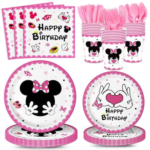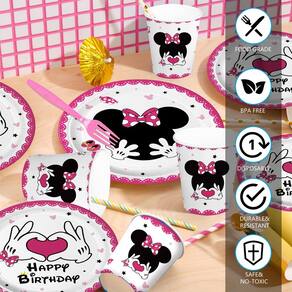 - ?Pratos de aniversário de rato de desenho animado? Os pratos e guardanapos de festa de aniversário da menina apresentam um rato rosa, com características fofas de desenho animado que parecem dançar vividamente. Todo o design usa uma combinação de rosa, adicionando atmosfera à festa de aniversário, e as crianças definitivamente vão adorar.