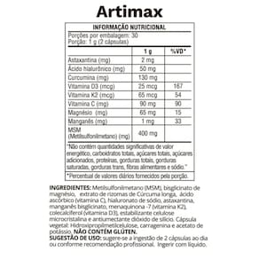 Colágeno hidrolisado: Auxilia na regeneração e fortalecimento das cartilagens articulares.Glucosamina: Componente essencial para o fortalecimento das articulações e prevenção de desgastes.Condroitina: Contribui para o alívio da dor e melhora da lubrificação das articulações.Ácido hialurônico: Melhora a elasticidade das articulações e promove a hidratação.Vitaminas e minerais: Auxiliam na absorção e eficácia dos ingredientes principais. Benefícios do Artimax (60 Caps): Fortalece as articulações: Melhora a saúde das articulações e cartilagens, auxiliando na sua regeneração.Aumenta a flexibilidade: Facilita o movimento e a mobilidade, proporcionando mais liberdade nas atividades diárias.Reduz inflamações: Combate processos inflamatórios, aliviando dores nas articulações.Prevenção de lesões: Ajuda a prevenir danos nas articulações, especialmente para pessoas com alto nível de atividade física.Melhora a lubrificação articular: Promove uma melhor lubrificação das articulações, contribuindo para a saúde geral delas.Alívio da dor: Proporciona alívio para dores articulares e musculares, principalmente em casos de desgaste.Ação antioxidante: Auxilia na proteção das células contra danos causados pelos radicais livres, preservando a saúde das articulações. Sugestão de uso:Para obter os melhores resultados com o Artimax (60 Caps), recomenda-se ingerir 1 cápsula por dia, preferencialmente junto à refeição principal.