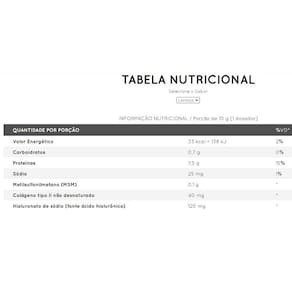 Colágeno hidrolisado, metilsulfonilmetano (MSM), cúrcuma, hialuronato de sódio obtido pela fermentação de Streptococcus zooepidemicus, gengibre, colágeno de frango com colágeno tipo II não desnaturado, pimenta preta, acidulante ácido cítrico, aromatizante natural e edulcorante glicosídeos de esteviol (estévia).NÃO CONTÉM GLÚTEN.CONTÉM AROMATIZANTE. Não contém quantidades significativas de gorduras totais, gorduras saturadas, gorduras trans e fibra alimentar. (*) % Valores diários não estabelecidos.