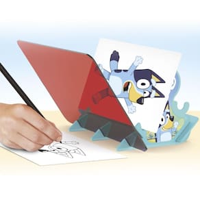 R: O kit inclui uma base de apoio, papel, lápis e cartelas com 4 personagens diferentes de Bluey para desenhar.