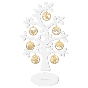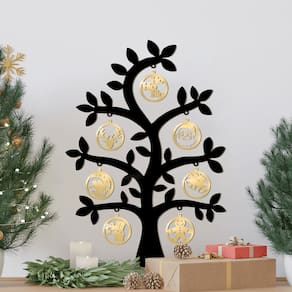 Material de ótima qualidade MDF revestido com papel resinado uma face de 3mm de espessura Resistência anti-risco, impermeável e anti-UV Tamanho da árvore: 28cm x 40cm Tamanho da base da árvore: 18cmx9,7cm Tamanho da bolinhas: 5,5cm