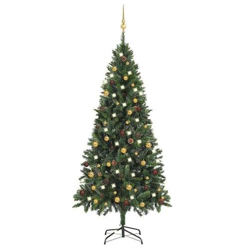 Imitando pinheiro, esta árvore de Natal tem galhos pontudos realistas com glitter verde nas pontas dos galhos, o que a torna extremamente densa. Esta linda árvore de Natal é leve e durável. Os ramos de agulha e pinhas naturais incluídos podem ser dispostos em qualquer formato. Esta árvore de Natal pode ser usada todos os anos, o que a torna uma escolha muito econômica em comparação com uma árvore real. Também tem uma base de ferro para estabilidade. Com luzes LED de eficiência energética, acende lindamente e cria uma atmosfera aconchegante de férias. Além disso, decorada com o belo pico e bolas, esta árvore de Natal será atraente em sua casa.