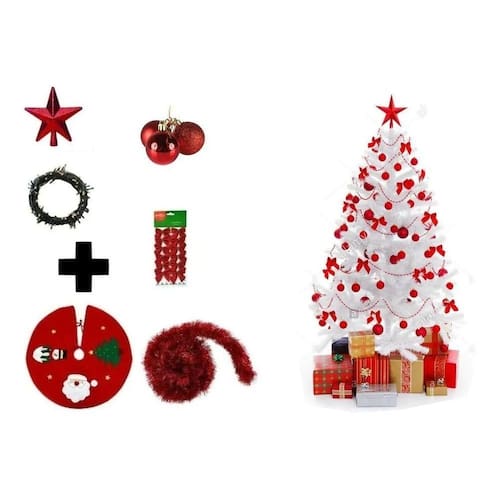 Árvore De Natal Branca Decorada 2,10 Cm 450 Galhos Com 7 Itens Este kit Contém: 1- Arvore de Natal 2- Pisca Pisca 3- Estrela Vermelha 4- 3 Festão Vermelho 5- Saia para Arvore de Natal (modelo pode variar mas a cor se mantém) 6- Pacote com 12 fitinhas vermelhas decorativas 7- 8 bolas Vermelhas ( 5 cm )