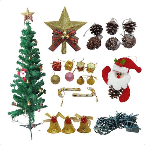 01 árvore de natal luxo de 1,20m de altura - com 110 galhos. 21 enfeites natalinos 2 bolas, 1 estrela, 5 sinos, 2 bengalas, 6 pinhas, 2 tambores, 2 presentes e 1 pinha papai noel ou boneco de neve . 01 pisca-pisca de 8m com 100 led colorido 110-127v - fio verde - 8 funções.