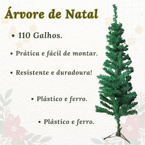 - altura: 1,20m - diâmetro da base: 30cm - quantidade de enfeites: 21 - tipo de iluminação: led colorido - 100 leds - 8m - fio verde - 8 funções - voltagem: 110-127v padrão brasileiro - potência: 2,5w - material: plástico de alta qualidade Marca: Zein Natal