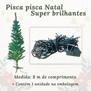 01 árvore de natal luxo de 1,20m de altura - com 110 galhos. 21 enfeites natalinos 2 bolas, 1 estrela, 5 sinos, 2 bengalas, 6 pinhas, 2 tambores, 2 presentes e 1 pinha papai noel ou boneco de neve . 01 pisca-pisca de 8m com 100 led colorido 220v - fio verde - 8 funções.