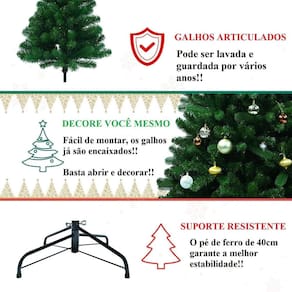 Árvore de natal grande verde canadense 2,10m 800 galhos Árvore de 800 galhos e 2,10 metros de altura - grande árvore de natal grande pinheiro canadense com base de ferro prática, pronta para uso, basta desdobrar os galhos, montar e decorar as árvores de natal são extremamente maleáveis e exigem apenas alguns minutos de seu tempo para ficar toda linda e decorada. Delicadas, permitem ajustes nas pontas dos galhos. Itens inclusos: -01 árvore de natal -01 base pé de ferro especificações - pronta para uso, basta desdobrar os galhos e decorar - formato de pinheiro canadense - cor verde tonalidade folha - galhos dobráveis - estrutura em tubo de metal galvanizado - altura montada 2,10m - diâmetro da base montada: aproximadamente 1,20m - galhos 800- diâmetro do pé: 40cm atenção pode ser lavada e guardada para usar por vários anos. do vendedor: 3 meses Marca: Não Informado Ean: 7894253510408