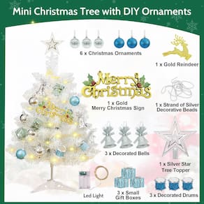 - AS PEQUENAS DECORAÇÕES BRANCAS DE ÁRVORE DE NATAL INCLUEM: Cada conjunto de miniárvore de Natal branca de 2 pés inclui uma variedade de acessórios: 1 peça de suporte branco para árvore de Natal, 1 peça de cobertura de árvore prateada, 1 peça de decoração “Feliz Natal”, 1 peça de rena decorativa, 3 peças pequenas bolas de Natal prateadas, 3 pequenas bolas de Natal azuis, 3 caixas de presente pequenas, 3 sinos decorados, 3 tambores decorados, 1 fio de contas decorativas prateadas.
