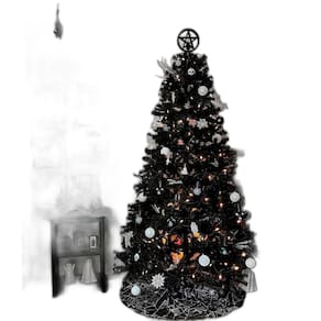 Mas esta árvore também tem um lado versátil. Quando o Halloween se aproxima, a árvore de Natal preta se transforma em um cenário perfeito para uma decoração temática assustadora. Com teias de aranha, morcegos e outros adereços de Halloween, ela se adapta facilmente à temporada de sustos.