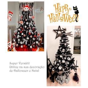 Mas esta árvore também tem um lado versátil. Quando o Halloween se aproxima, a árvore de Natal preta se transforma em um cenário perfeito para uma decoração temática assustadora. Com teias de aranha, morcegos e outros adereços de Halloween, ela se adapta facilmente à temporada de sustos.
