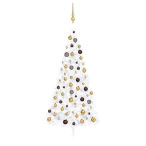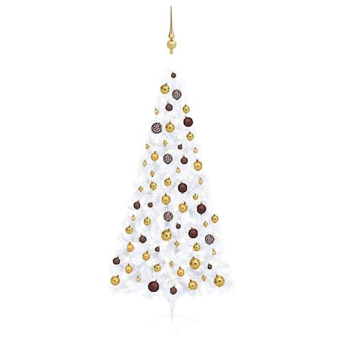 - Esta árvore de Natal artificial meio pré-iluminada é uma adição fabulosa às suas decorações natalinas. Com 70,9 polegadas de altura, foi especialmente projetado para se encaixar perfeitamente em paredes ou cantos, aproveitando ao máximo seu espaço limitado. Adornada com bolas de ouro brilhante, ouro fosco e bronze contra um fundo branco elegante, esta árvore elegante traz calor e charme festivo, criando uma peça central ideal para sua sala de estar ou qualquer local interno nesta época festiva.