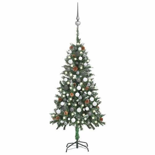 - Pinhas e bolas decorativas: inclui pinhas naturais e uma variedade de bolas em branco brilhante e cinza brilhante, juntamente com um pico brilhante, adicionando um toque festivo à árvore