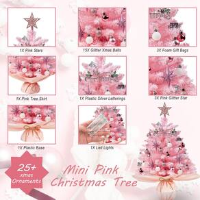 Nossa mini árvore de Natal é uma charmosa árvore de mesa, perfeita para dar um toque festivo a qualquer espaço pequeno. Medindo 20 polegadas de altura, tem o tamanho certo para sentar em cima de uma escrivaninha, prateleira ou mesa. A árvore é adornada com algumas decorações clássicas que evocam o espírito do Natal. Cada enfeite cuidadosamente escolhido para complementar os outros. Nossa pequena árvore de Natal é uma adição deliciosa e festiva a qualquer casa, trazendo alegria e alegria a todos que a contemplam. - Mini árvore de Natal: com 20-23 polegadas de altura e 13 polegadas de largura, uma árvore artificial com galhos inteiros fáceis de afofar feitos de PVC pode criar uma atmosfera natalina para sua casa ou escritório - Design atualizado: diferente da minitárvore tradicional, é menor e mais leve, fácil de armazenar e transportar. A base semicircular aumenta a estabilidade da pequena árvore, que pode ser colocada firmemente na mesa sem cair - Decoração de Natal: vem com rosa saia de árvore, enfeites de bola de Natal rosa. Insira o suporte, abra as dicas e o estilo de acordo com a aparência desejada. Esta mini árvore de natal com luzes é um ótimo complemento para a decoração do seu quarto durante o Natal. Fácil de configurar e armazenar: galhos e pré-luzes convenientes facilitam a configuração e a desmontagem. Basta soltar os galhos, pendurar as decorações de Natal, enrolar o fio de luz LED e inserir 3 pilhas AA (não incluídas) na caixa da bateria. Ideal para qualquer ocasião: ótima opção para decorar a casa e o escritório durante o Natal e outras ocasiões. Ótimo para pessoas com alergia ao pinho verdadeiro. Você pode decorá-las em armários, mesas, sofás, janelas, mesas de cabeceira, mesas de jantar, etc.