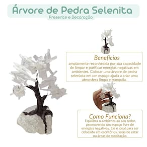 Feita com cristais de selênio ou selenita, e projetada para representar uma árvore, com seus galhos e raízes esculpidos. A seleniota, ou selenita, é uma variação do mineral gesso e é muito conhecida por suas propriedades energéticas e espirituais, além de ser uma das pedras mais puras e eficazes em práticas de cura.