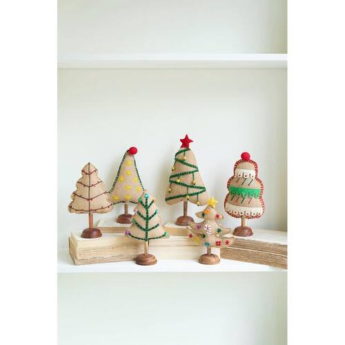 Essas árvores festivas criam o clima alegre. Este conjunto de seis árvores de feltro decoradas foi feito para ser colocado em prateleiras ou mesas ou para deixar os netos se organizarem. Adicione toques de feltro à sua vila de férias ou cena invernal com essas árvores. GG: 12" t Grande (2): 10,5” t Médio (2): 9" t Pequeno: 8" t Medidas adicionais BASE (todas): 2,5" d x 1,25" t Código UPC: 841628103762 Um lado. O conjunto inclui 6 peças. Um para cada design. Limpe com um pano seco e sem fiapos. Peças pequenas. Não é um brinquedo.