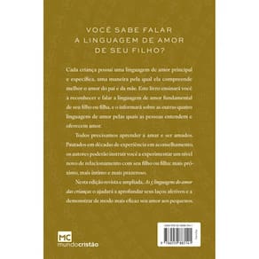 Você sabe falar a linguagem de amor de seu filho? Cada criança possui uma linguagem de amor principal e específica, uma maneira pela qual ela compreende melhor o amor do pai e da mãe. Este livro ensinará você a reconhecer e falar a linguagem de amor fundamental de seu filho ou filha, e o informará sobre as outras quatro linguagens de amor pelas quais as pessoas entendem e oferecem amor. Todos precisamos aprender a amar e ser amados. Pautados em décadas de experiência em aconselhamento, os autores poderão instruir você a experimentar um nível novo de relacionamento com seu fIlho ou filha: mais próximo, mais íntimo e mais prazeroso. Nesta edição revista e ampliada, As 5 linguagens do amor das crianças o ajudará a aprofundar seus laços afetivos e a demonstrar de modo mais eficaz seu amor aos pequenos