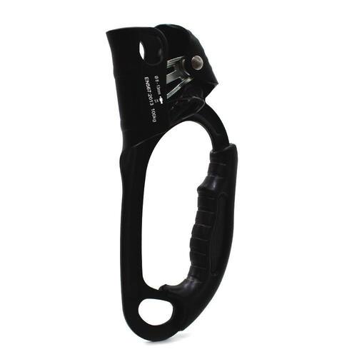 Blocante para progressão em corda, confeccionado em chapa de alumínio de alta resistência, com tratamento anodizado, dotado de sistema de engate rápido e empunhadura ergonômica, possui espaço para fixação de mosquetão para fixação do estribo, sistema de bloqueio anti-derrapante.