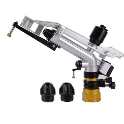 Aspersor canhão de irrigação setorial jolly 19 a 29 metros com ângulo regulávelEsse aspersor vai com um bocal já rosqueado, além de dois bocais. O aspersor tem a regulagem do ângulo de funcionamento. Movimentando as hastes você consegue erguer até a altura desejada, além de poder liberar o aspersor para ele fazer de 360, 180, 90 ou até mesmo ficar parado