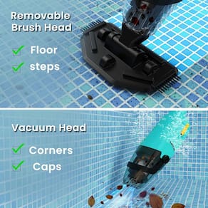 - Este aspirador de piscina sem fio tem dois modos de limpeza, alterne entre a cabeça da escova removível para limpar degraus e pisos da piscina ou a cabeça do aspirador para cantos e áreas difíceis de alcançar. Design versátil para todos os tipos de limpeza de piscinas.