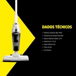 Combina potência e versatilidade para uma limpeza eficiente. Com motor de 1000W, vácuo máximo de 170 mbar e vazão de 17 L/s, remove a sujeira com alto desempenho. Seu reservatório lavável de 600ml facilita o descarte, enquanto o filtro HEPA retém até 99,9% dos fungos e ácaros, garantindo um ambiente mais saudável. Pode ser como aspirador vertical ou de mão, sendo ideal para pisos, carpetes, estofados e lugares altos. Além disso, possui cabo elétrico de 5 metros e alça projetada para proporcionar mais conforto durante o uso.Tipo de coletor