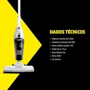 Combina potência e versatilidade para uma limpeza eficiente. Ideal para pisos, carpetes, estofados e lugares altos. Possui cabo elétrico de 5 metros e alça projetada para proporcionar mais conforto durante o uso.Tipo de coletor